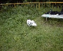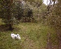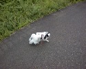 池の端の草地にきたらバイクが置いてあるのか、捨ててあるのか、なんだこれはと覗きながら、何故か後足で砂をかける仕草。 |