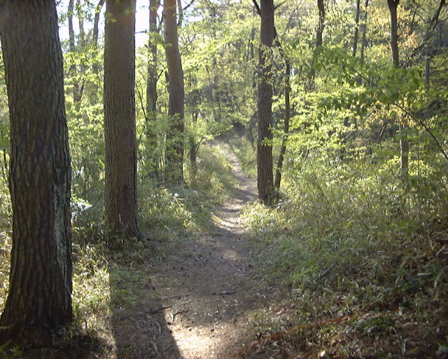 登りきるといかにも林道という道が(後で地図を見るとからまつの道とありました。2つ目の赤い印のところです)。 こういう道でない道を行くのは、賢君とのお散歩以来なので結構良い気分です。 |
