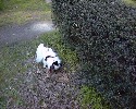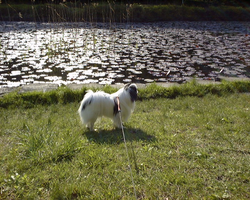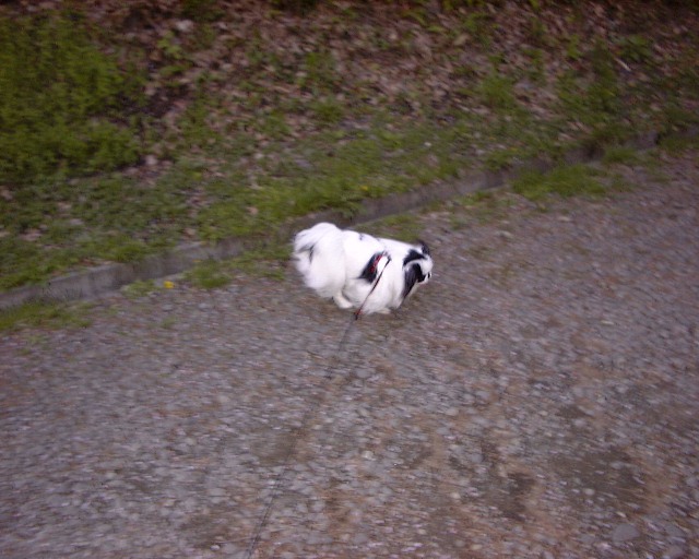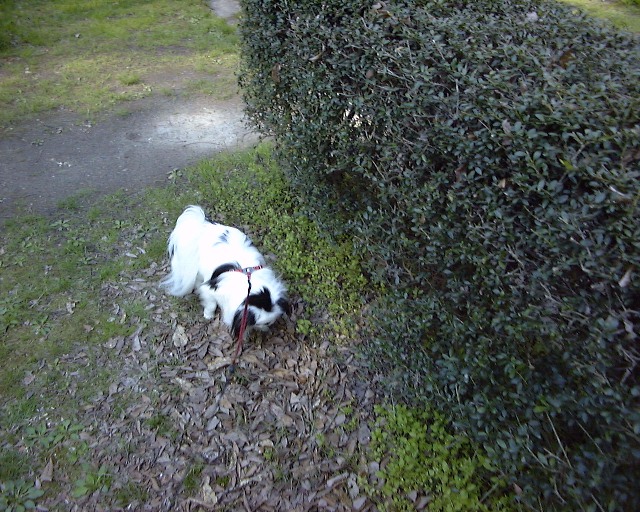 お散歩ルックになった金太郎君、「お散歩」と思ったのに、車に乗って20分(やけに道が混んでた)、ここどこ、と知らない場所で、一生懸命クンクンと臭いかぎにご執心です。 |