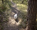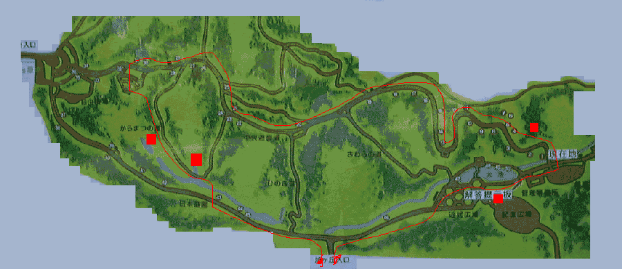 行きたいように行かせていると、どんどん道を離れて、道無き道を進み、別な道へ、、 「こっち行こう」と橋を渡って待っています(1つ目の赤い印のところです)。この橋の先には足場の悪い急な上り坂が待っていました。。。 金太郎が先にさっさと登って行く後を、「人間は2本足だから、君たちより安定性が悪いんだ」とブツブツ言いながら、ノタノタと飼い主Bが追っていきます。 |