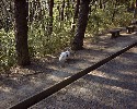 コースも終わりに近くなって、大池にやってきました(4つめの赤い印のところです)。池にははすの葉でしょうか、池一面にぷかぷかと漂っています。興味深いのか、池の側に寄って行きます。保護者は、落ちるなよと、リードを短く、しっかり持ってました。 池の端に鴨(?)が二羽、本を読んでいる人の側で日向ぼっこしてました。 |
