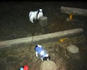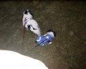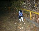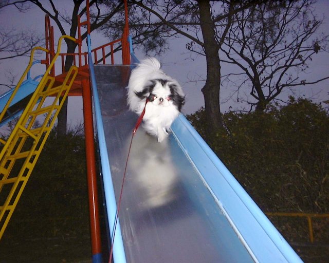 金太郎の隣にきて、なんとか落ち着いた、とはいえない銀ちゃんです。 このあと銀ちゃんのリードを引いて滑らせました。 スーパーマンポーズで指を一杯にひろげて、落ちてきました。 |