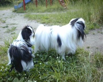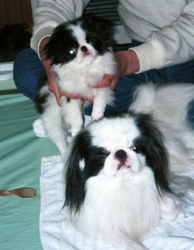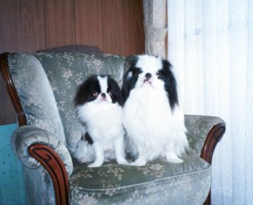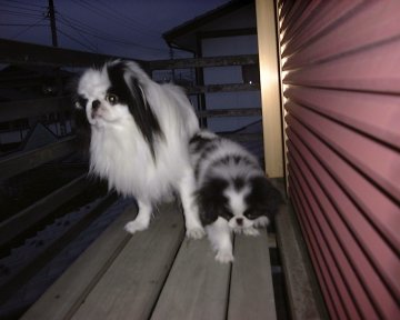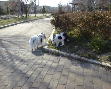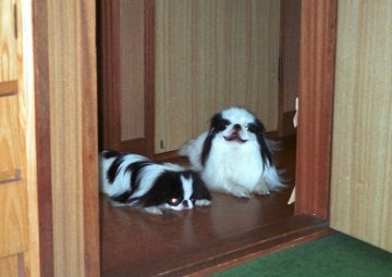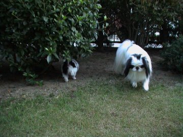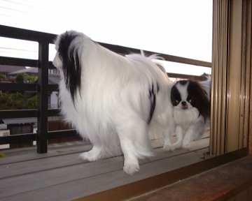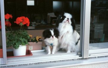 1999/10/24です。 金太郎と銀次郎を並べると、同じ狆とは思えないような差があります。 家の中では大きく感じる金太郎も、外に出ればやっぱり小さい。 |