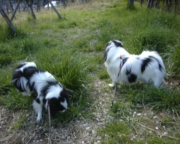 2000/4/8です。 銀ちゃんのお散歩が早くなりました。たまに金兄ちゃんより前に進んだりできるようになりました。 もっとも、体の大きさが違いますから体力や瞬発力では相手になりません。 |