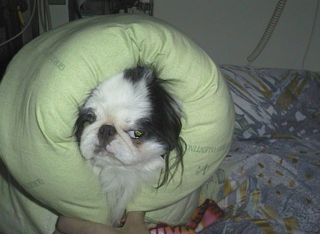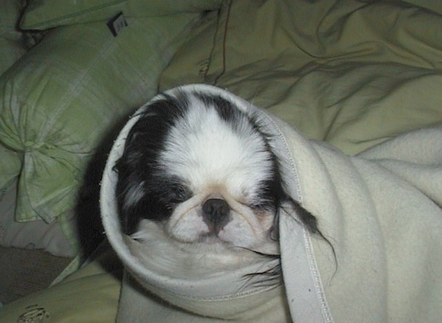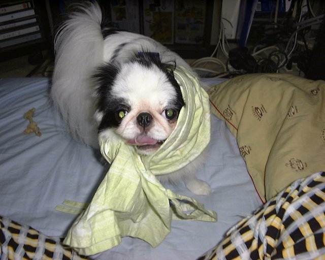 これは毛布でくるんでいるのですが、ねむねむで、「僕眠いから勝手にして」という状態。 |